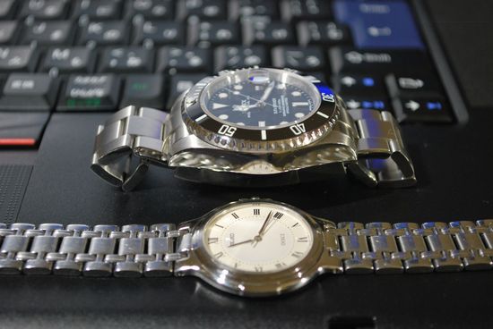 下は ROLEX SUBMARINER 116610LN と並べた写真。SEIKO DOLCE の小ささがよく分かる。