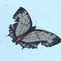 学校の窓ガラスに見たことがないチョウがいたので写真を撮った。窓の内側で逆行気味なので色が出ていないが、ステンドガラスのような美しいチョウであった。名前はイシガケチョウ(石崖蝶)、或いはイシガキチョウ(石垣蝶)で、白地に、黒色の細かい筋模様が複雑に走る翅( ...