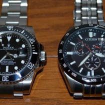 下の写真は、ロレックス サブマリーナ Ref.116610LN と シチズン AT3004-58E 。ロレックスは自動巻きの機械式、シチズンはソーラー電波式で、対極的な腕時計である。シチズンの電波腕時計は RADIO CONTROLLED そして Eco Drive であるが、それは、「Radio=電波」「Contoroll ...