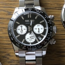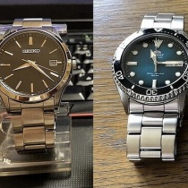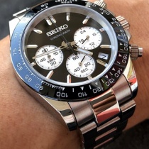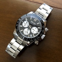 最近は遊び心でデイトナ風セイコークロノグラフを好んで着用している。白色文字盤に黒色インダイアルのパンダの時計が人気だが、自分好みの逆パンダにしている。また、クロノグラフは止まっているクロノ針が好きではないので、目立たない黒色の針にした。黒色の主ダイアルは5 ...